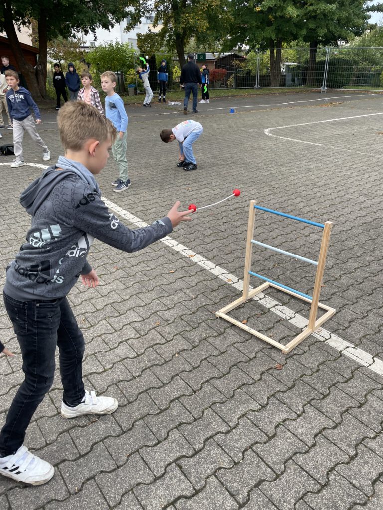 Kurz vor den Herbstferien gab es für die Kinder der Vorklasse und des Jahrgang 4 eine tolle Überraschung: Am Platz Brassac warten viele neue Spielgeräte darauf, ausprobiert zu werden! Dank einer großzügigen Spende der Autohaus Michel GmbH konnten neue Spielsachen wie Spikeball, Leitergolf und verschiedene Sprung- und Wurfspiele angeschafft werden. In der Monatsfeier vor den Herbstferien stellte die Klasse 4d den anderen Kindern die neuen Spielgeräte vor. Anschließend durften alle Schülerinnen und Schüler die Spiele auf dem Schulhof selbst ausprobieren. Seitdem werden die neuen Spielgeräte in jeder Pause gerne genutzt und sorgen für noch mehr Spaß und Abwechslung auf dem Schulhof.